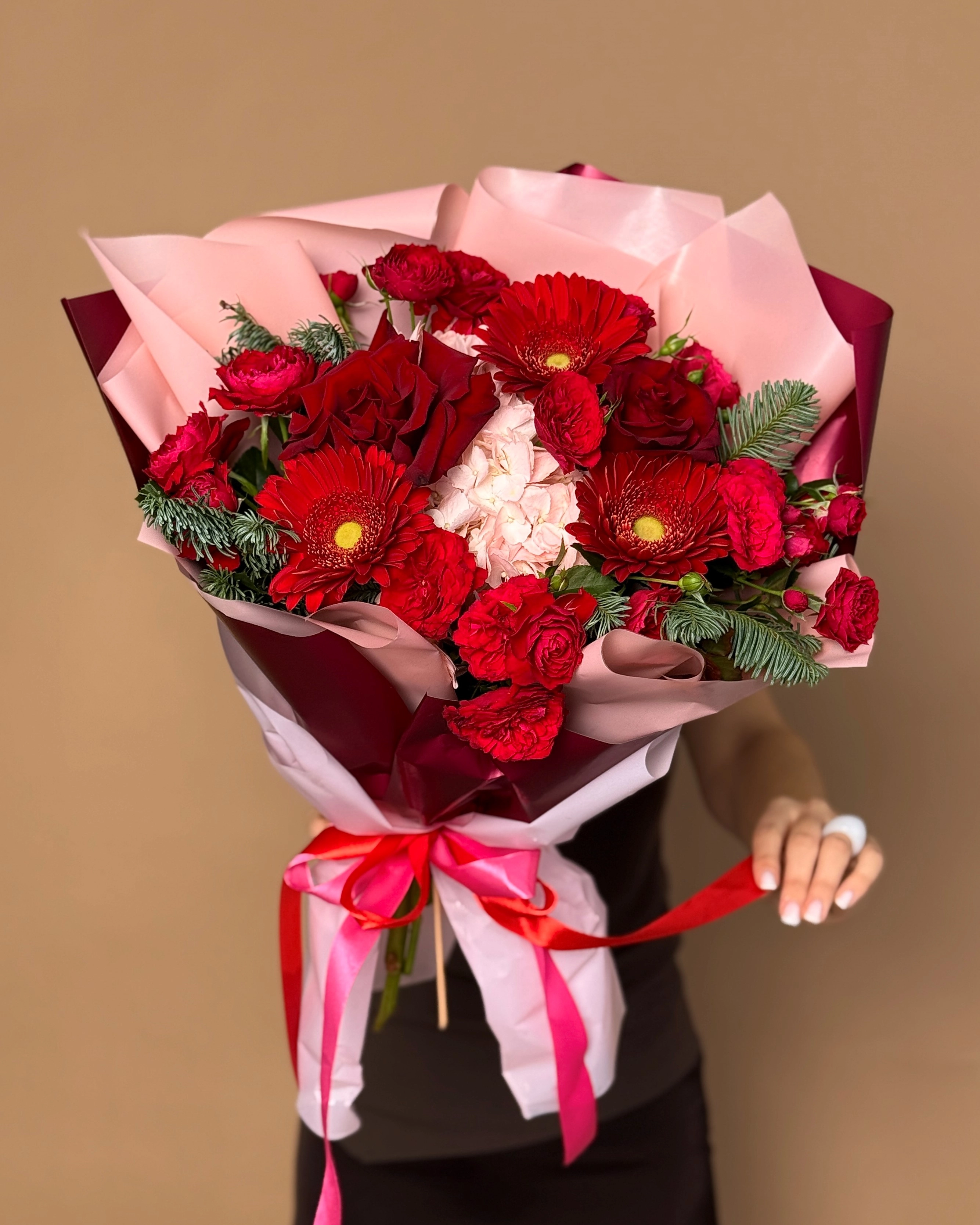 Пронзительный зимний букет с розами и герберами
