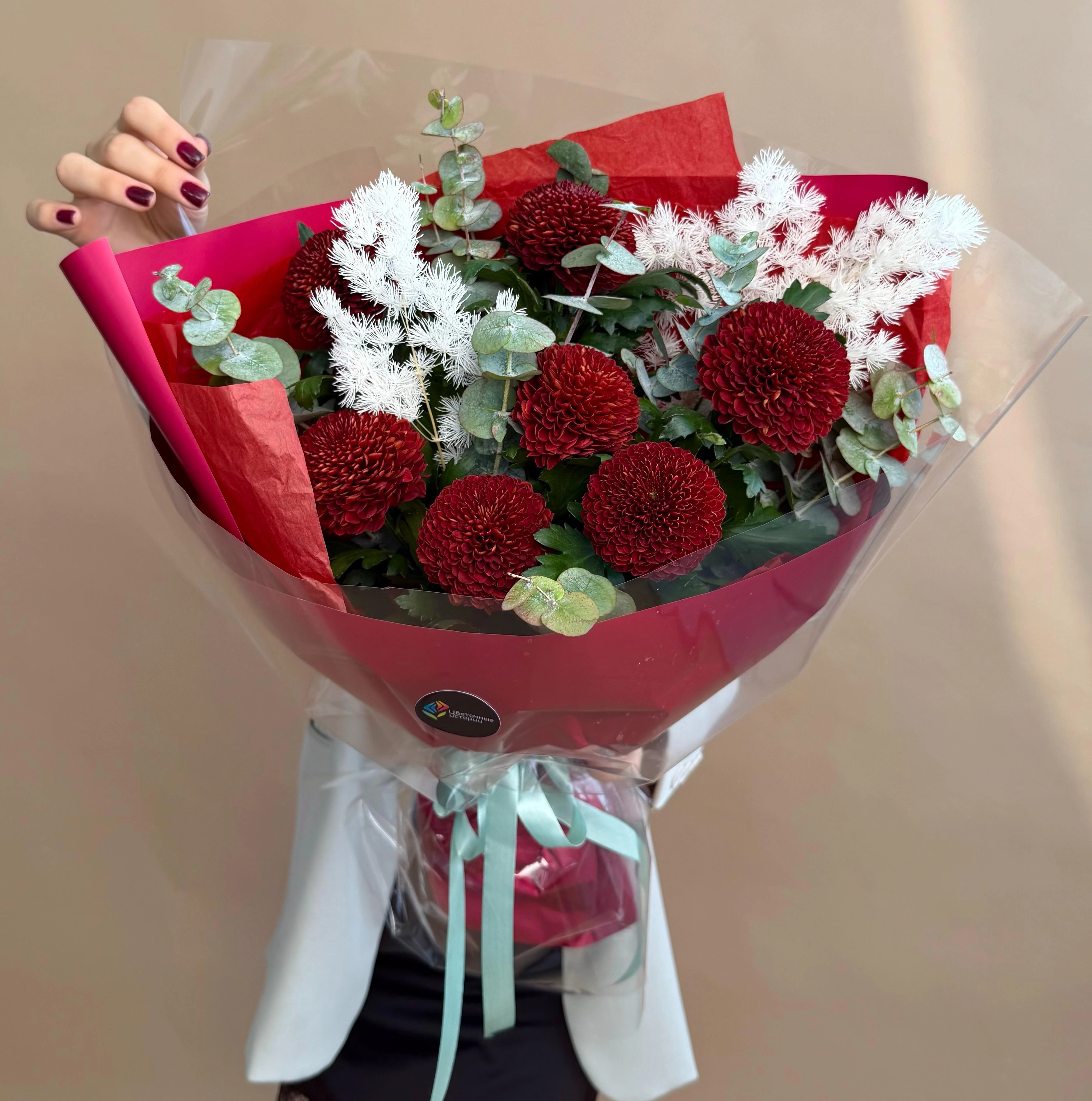 Большой букет ярких хризантем с зеленью