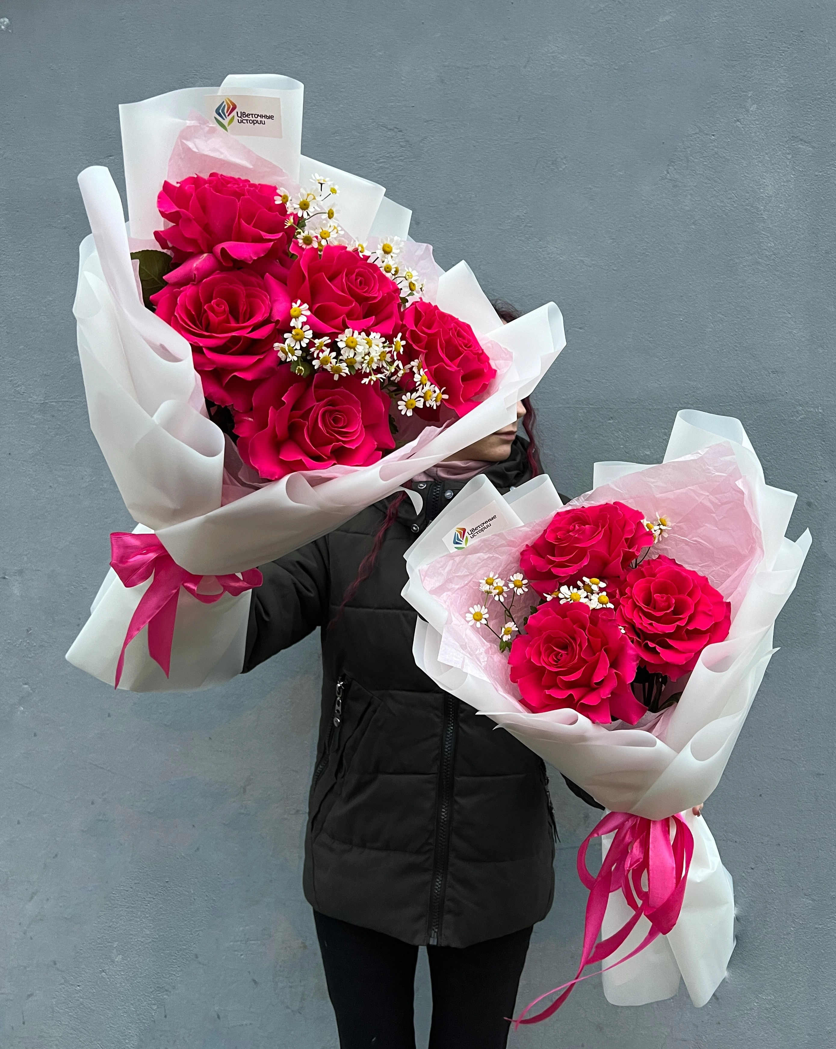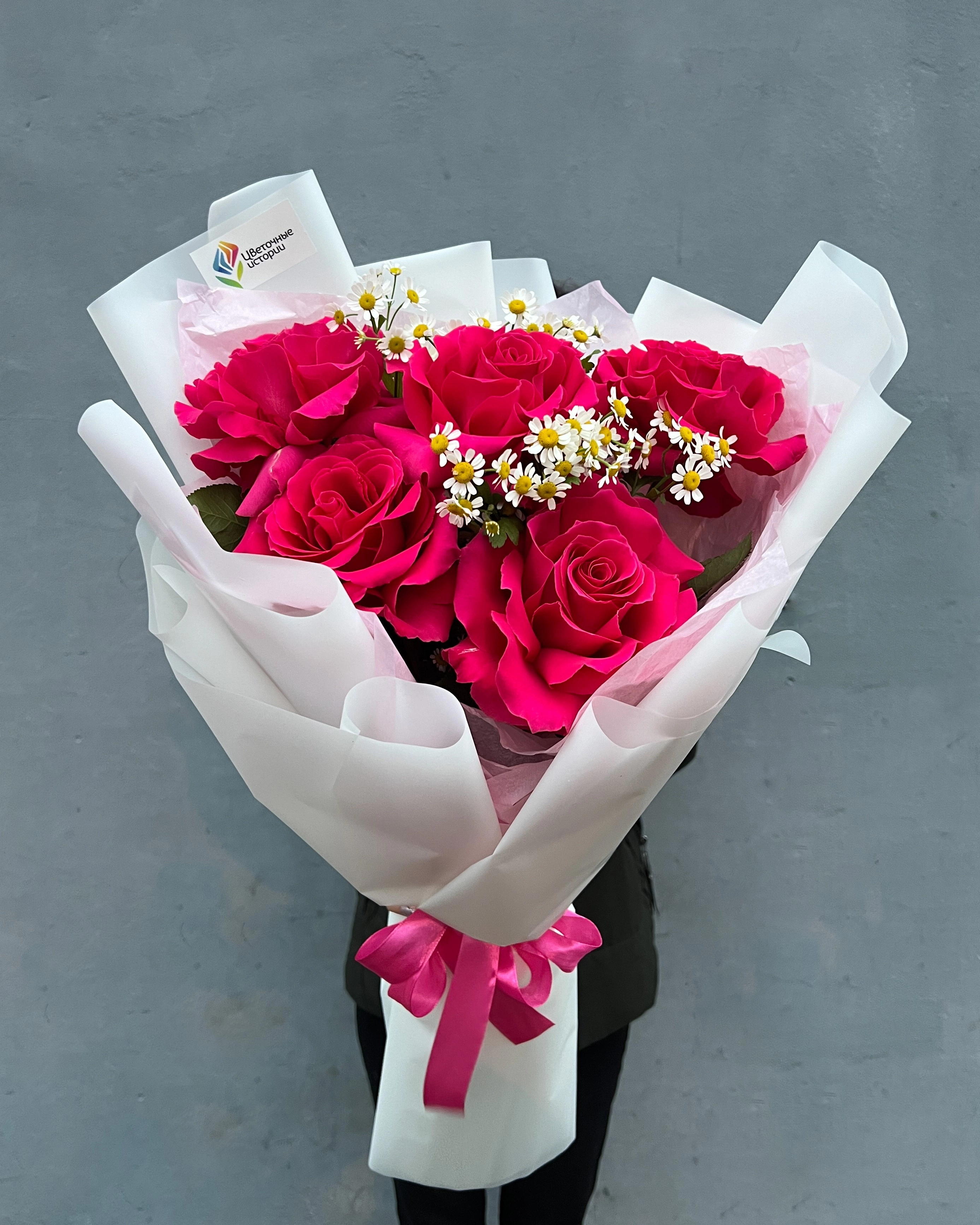 Состав букета: Танацетум: 2 шт, Роза 50/60 см (Эквадор): 5 шт