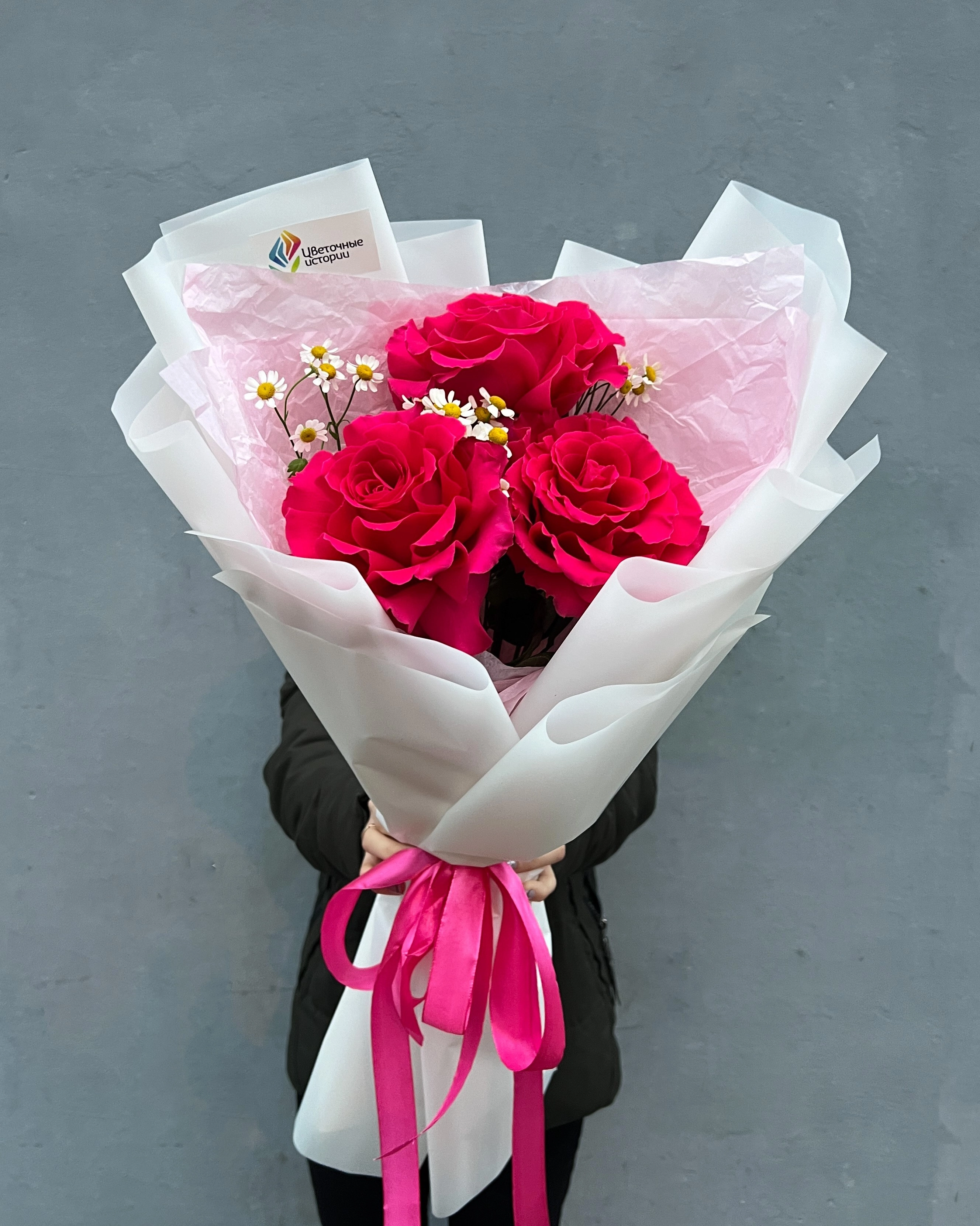 Состав букета: Танацетум: 1 шт, Роза 50/60 см (Эквадор): 3 шт