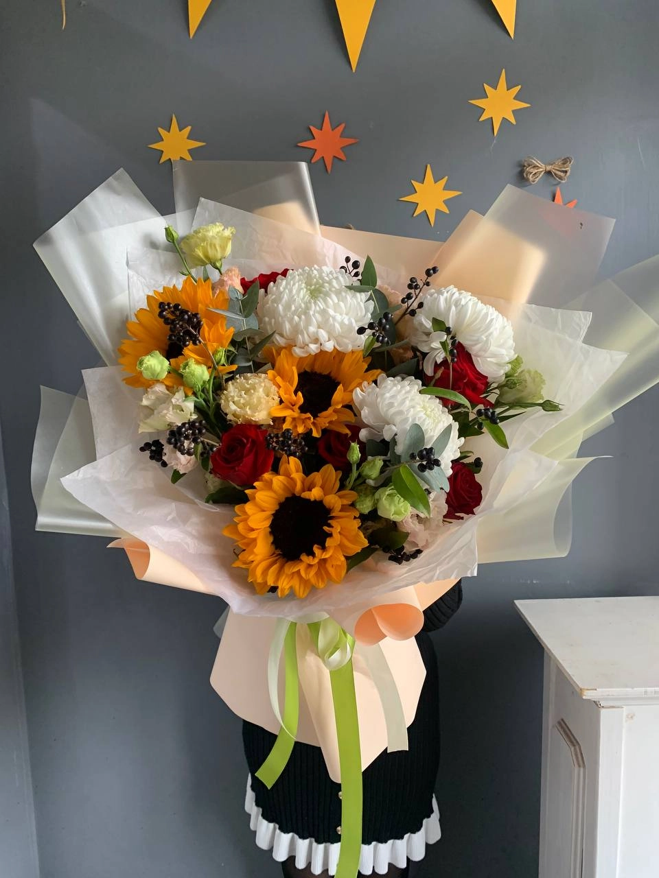 Изящный букет из подсолнухов, одноголовых хризантем и роз