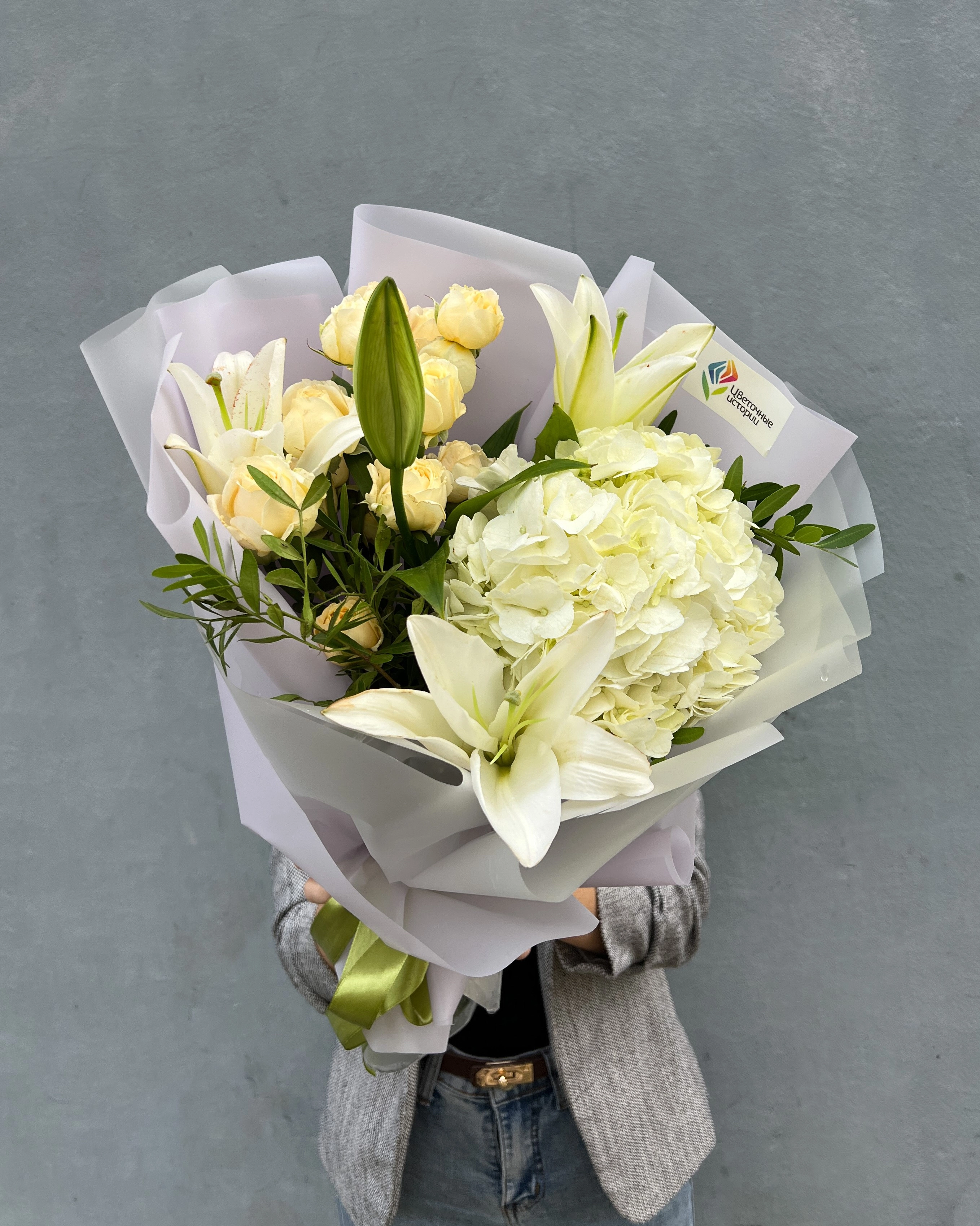 Состав букета: Лилия: 1 шт, Гортензия: 1 шт, Роза кустовая пионовидная 50/60 см: 2 шт, Писташ: 1 шт