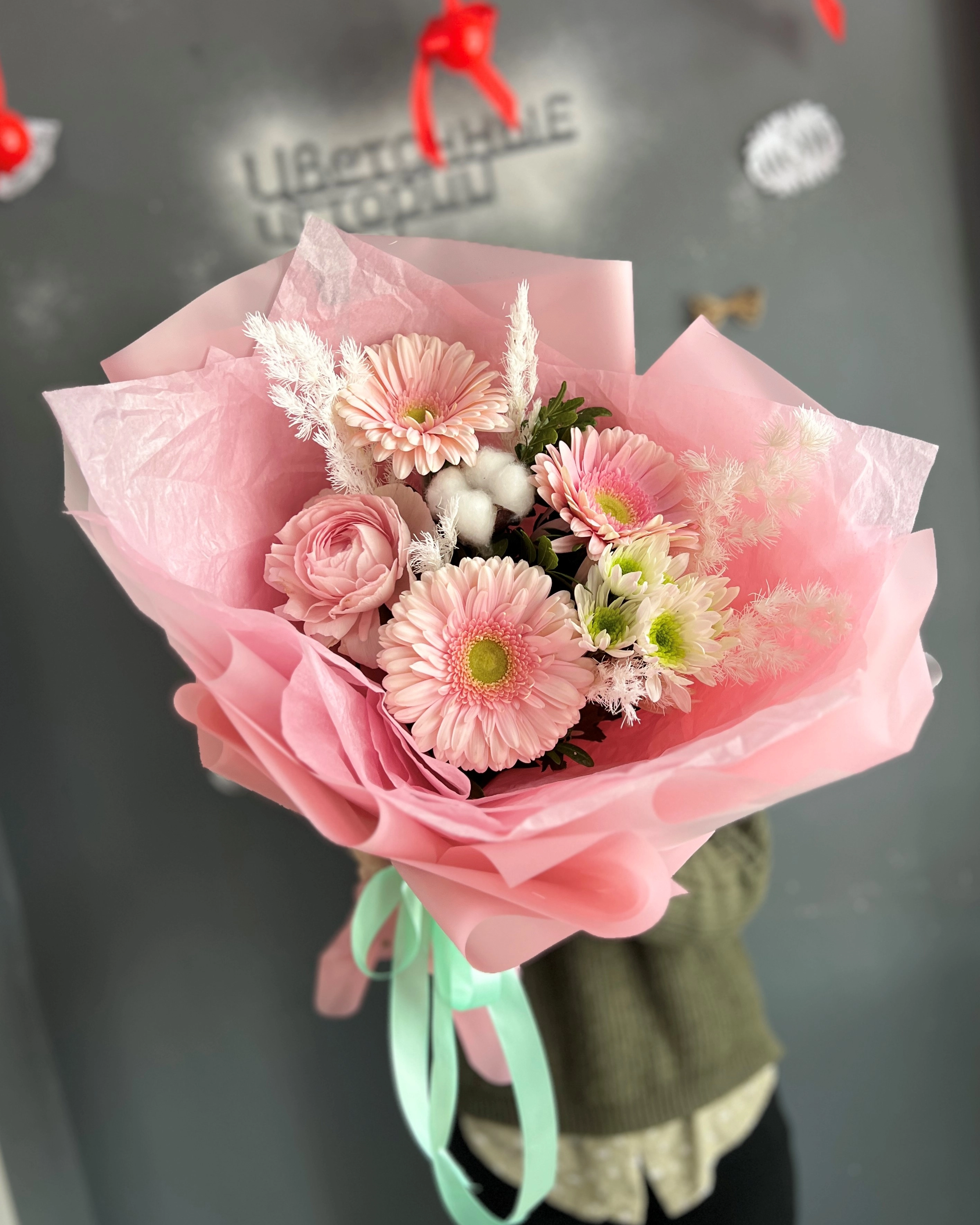 Состав букета: Хризантема кустовая: 1 шт, Хлопок: 1 шт, Писташ: 1 шт, Гербера: 3 шт, Ранункулюс: 1 шт