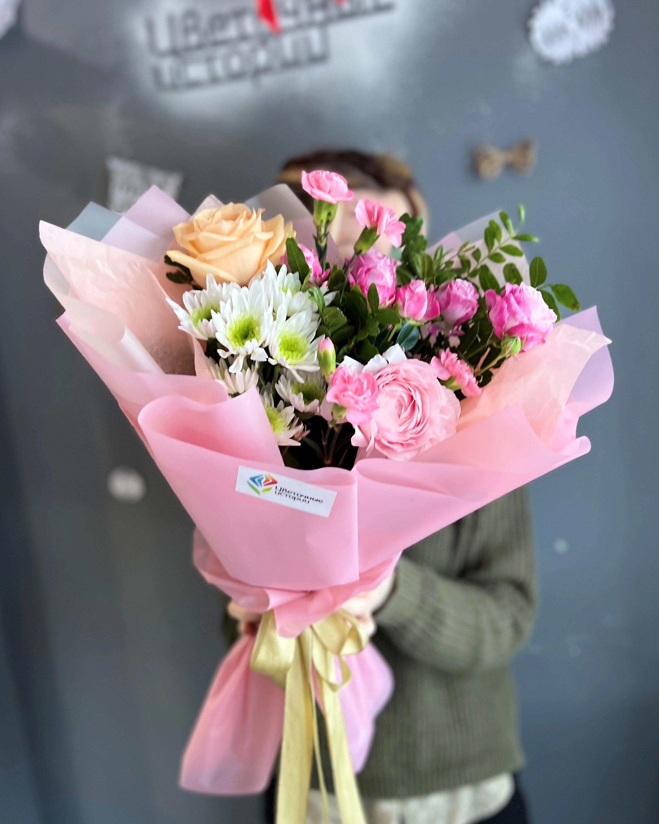 Состав букета: Хризантема кустовая: 1 шт, Роза кустовая пионовидная 50/60 см: 1 шт, Роза 50/60 см (Россия): 1 шт, Диантус кустовой: 2 шт, Писташ: 1 шт, Ранункулюс: 1 шт