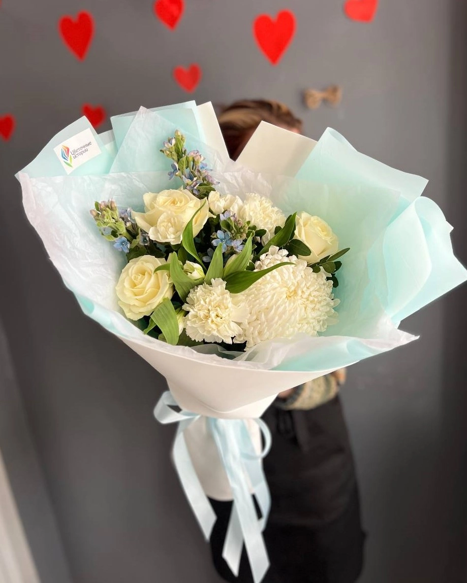 Состав букета: Хризантема одноголовая: 1 шт, Роза 50/60 см (Россия): 3 шт, Твидия: 3 шт, Альстромерия: 1 шт, Диантус цветной: 2 шт, Диантус кустовой: 1 шт, Писташ: 1 шт