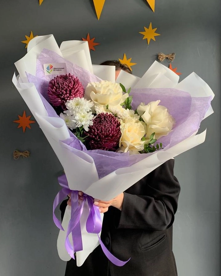 Сказочный букет из премиальных хризантем, французских роз и зелени