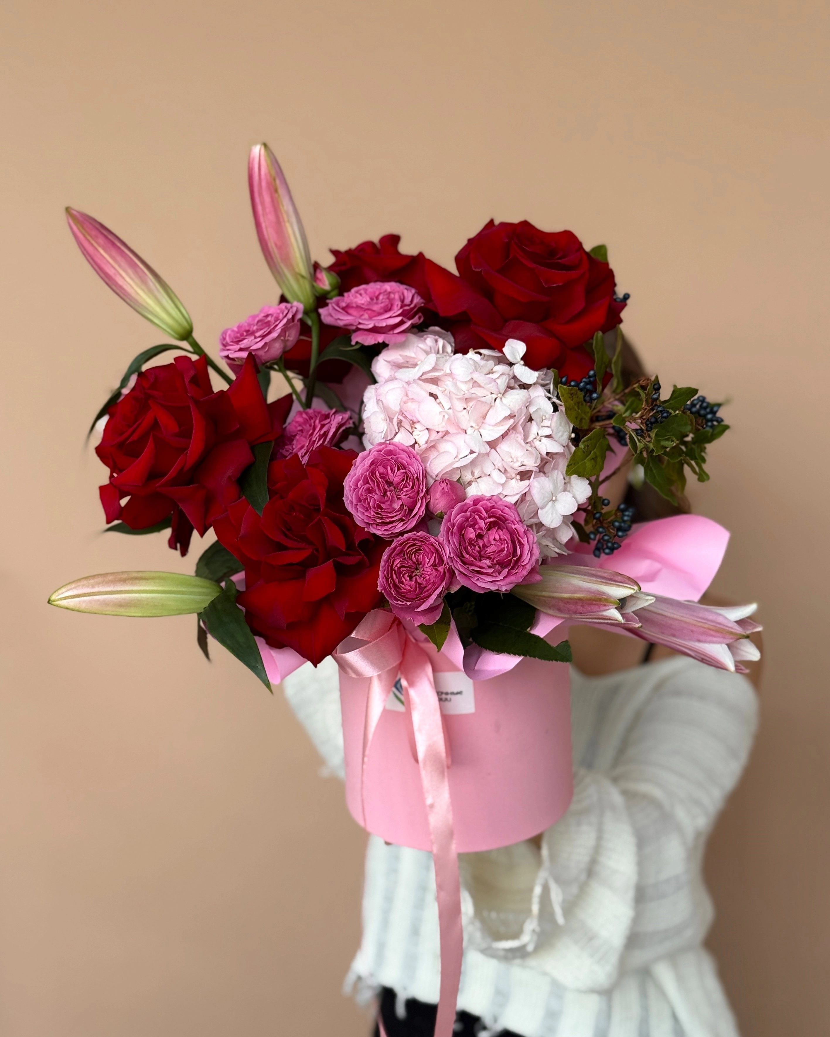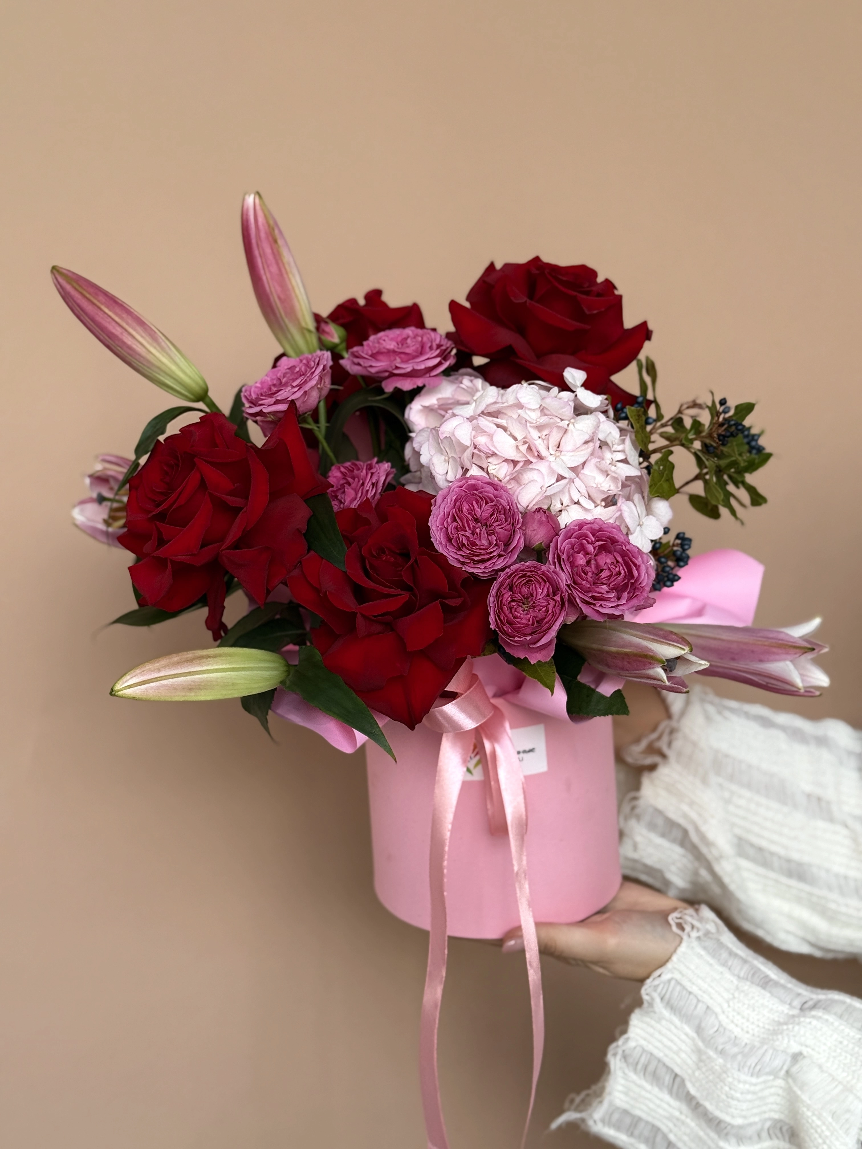 Состав букета: Роза 50/60 см (Эквадор): 4 шт, Гортензия: 1 шт, Роза кустовая акция: 2 шт, Лилия: 1 шт, Вибурнум: 1 шт