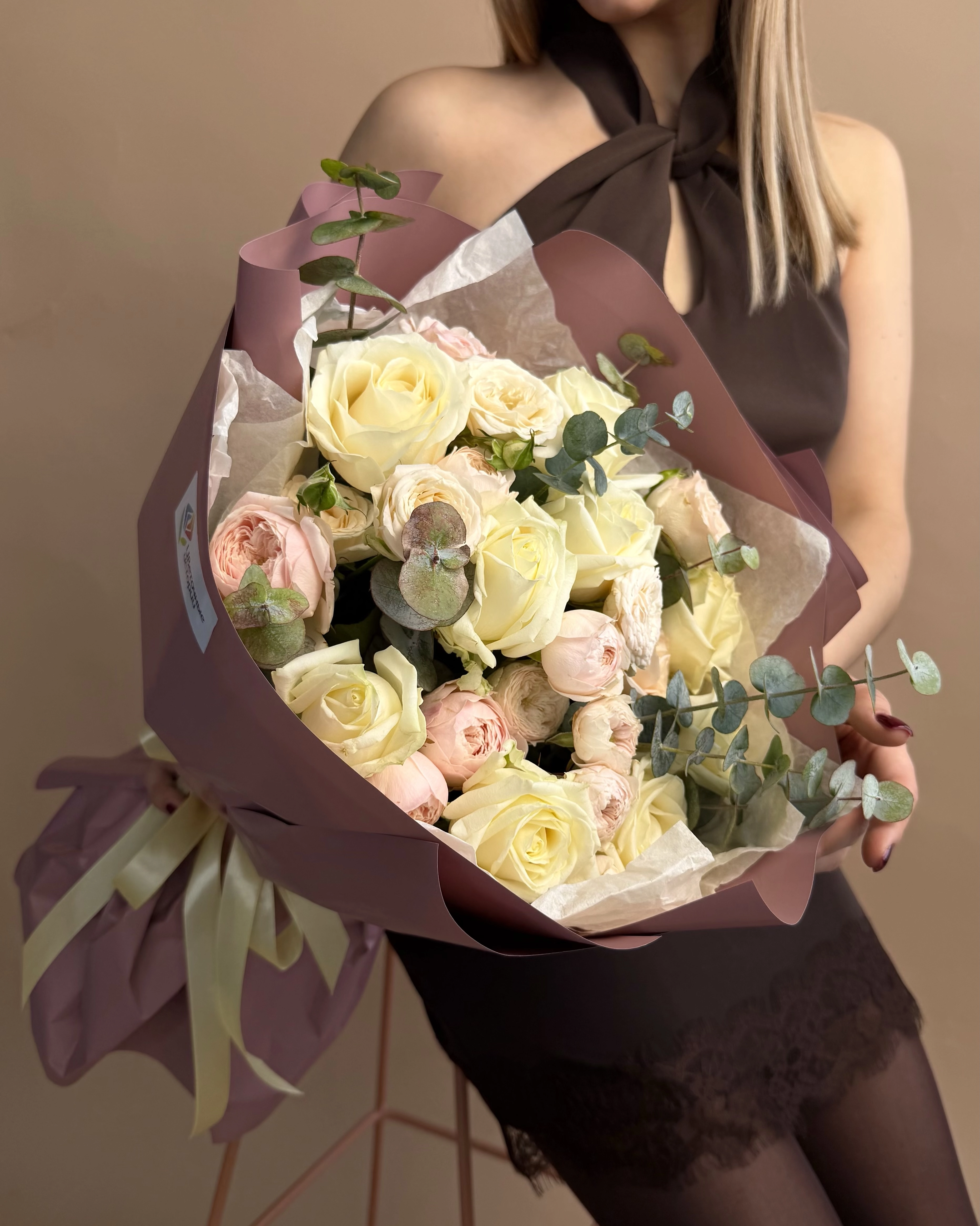 Состав букета: Роза 50/60 см (Россия): 9 шт, Роза кустовая акция: 8 шт, Эвкалипт: 1 шт