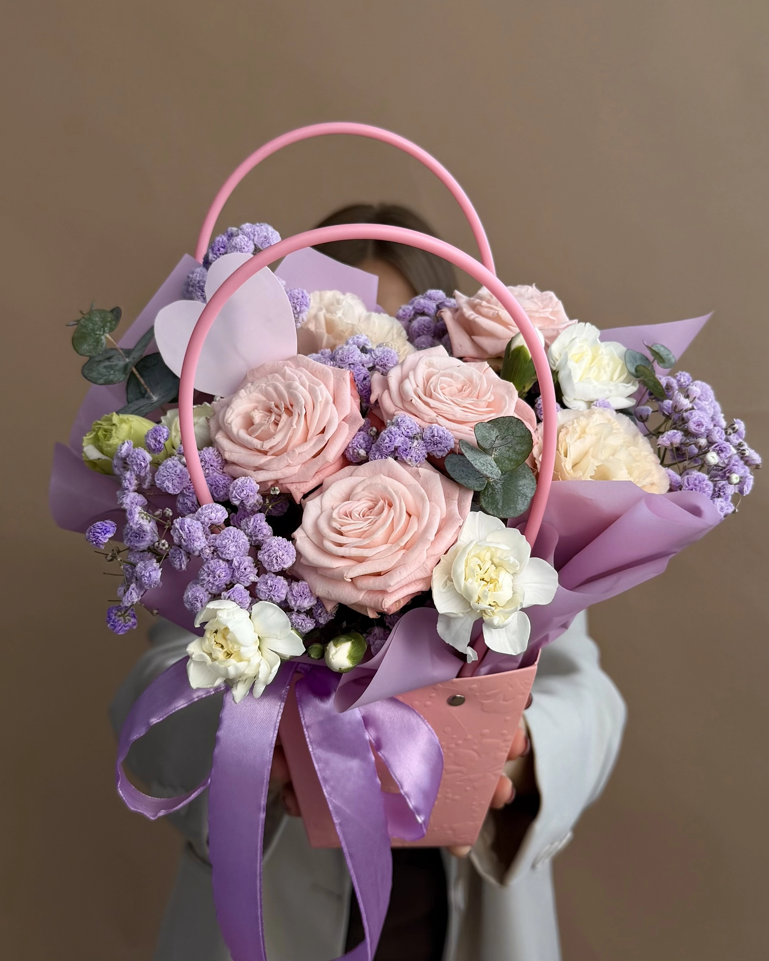Состав букета: Диантус кустовой: 2 шт, Эвкалипт: 0,5 шт, Роза кустовая пионовидная 50/60 см: 1 шт, Эустома: 1 шт, Гипсофила стабилизированная: 2 шт