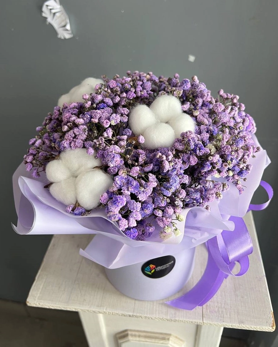 Состав букета: Гипсофила стабилизированная: 4 шт, Хлопок: 3 шт