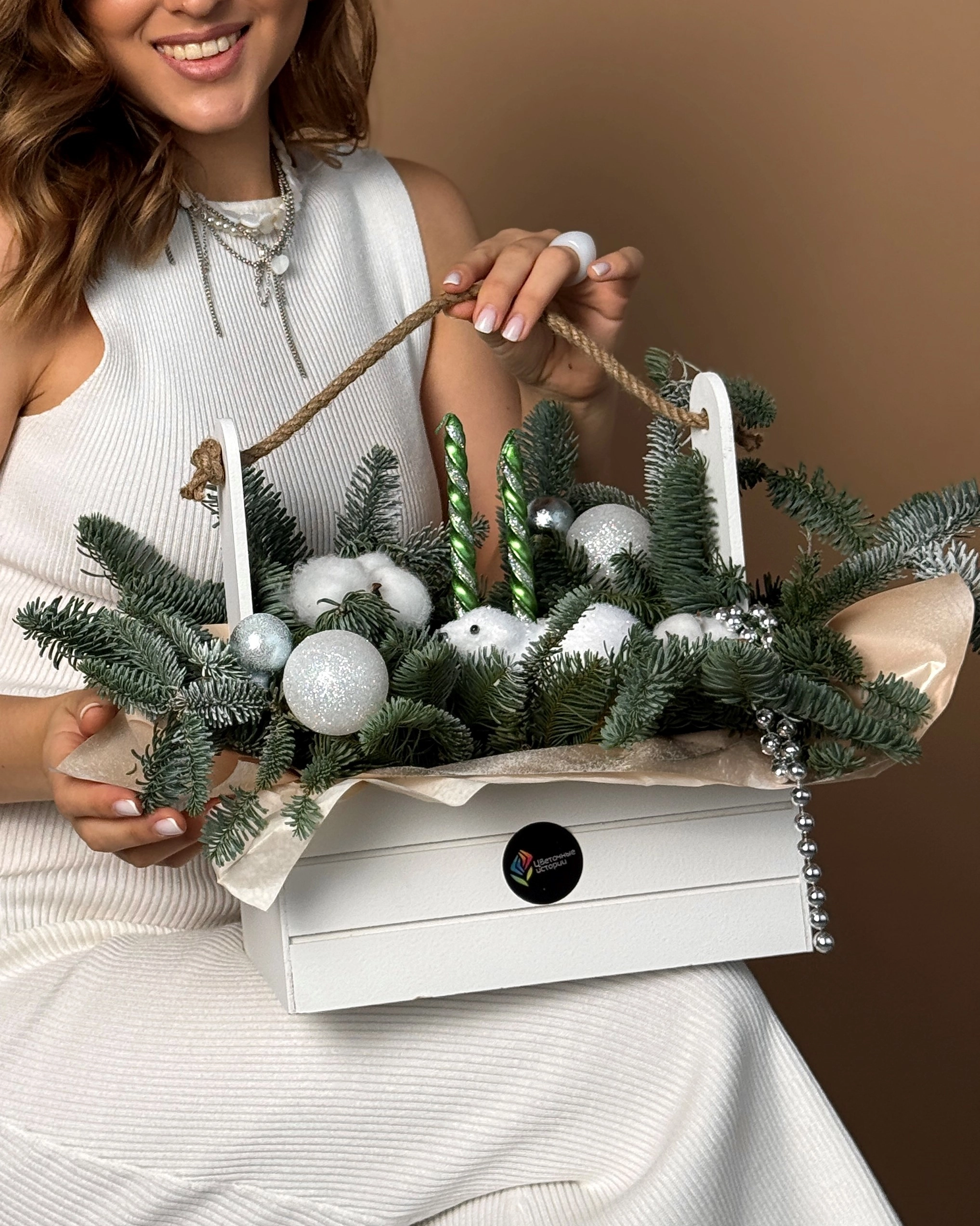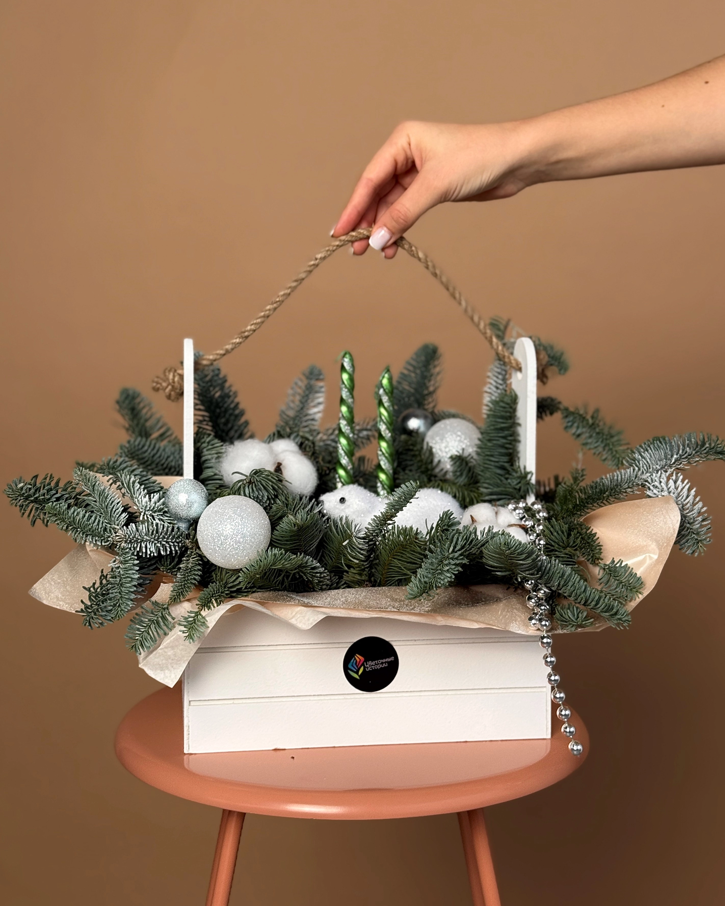 Упаковка: Ящик реечный деревянный: 1 шт, Губка флористическая: 1 шт, Пленка лайт: 0,5 шт, Свеча витая: 2 шт, Новогодняя игрушка лайт: 4 шт, Бусы: 0,3 шт, Новогодняя игрушка "Медведь": 1 шт