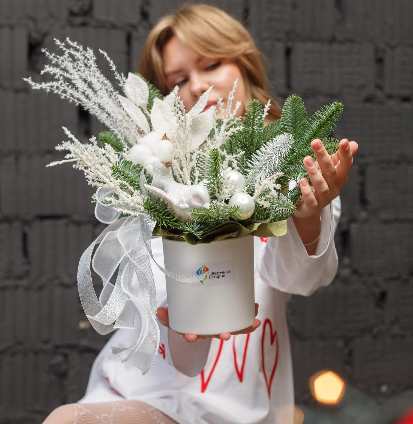 Упаковка: Новогодняя игрушка лайт: 1 шт, Новогодний декор "Птичка": 1 шт, Коробка шляпная маленькая: 1 шт, Губка флористическая: 0,5 шт, Органза: 1 шт, Лента атласная: 1 шт