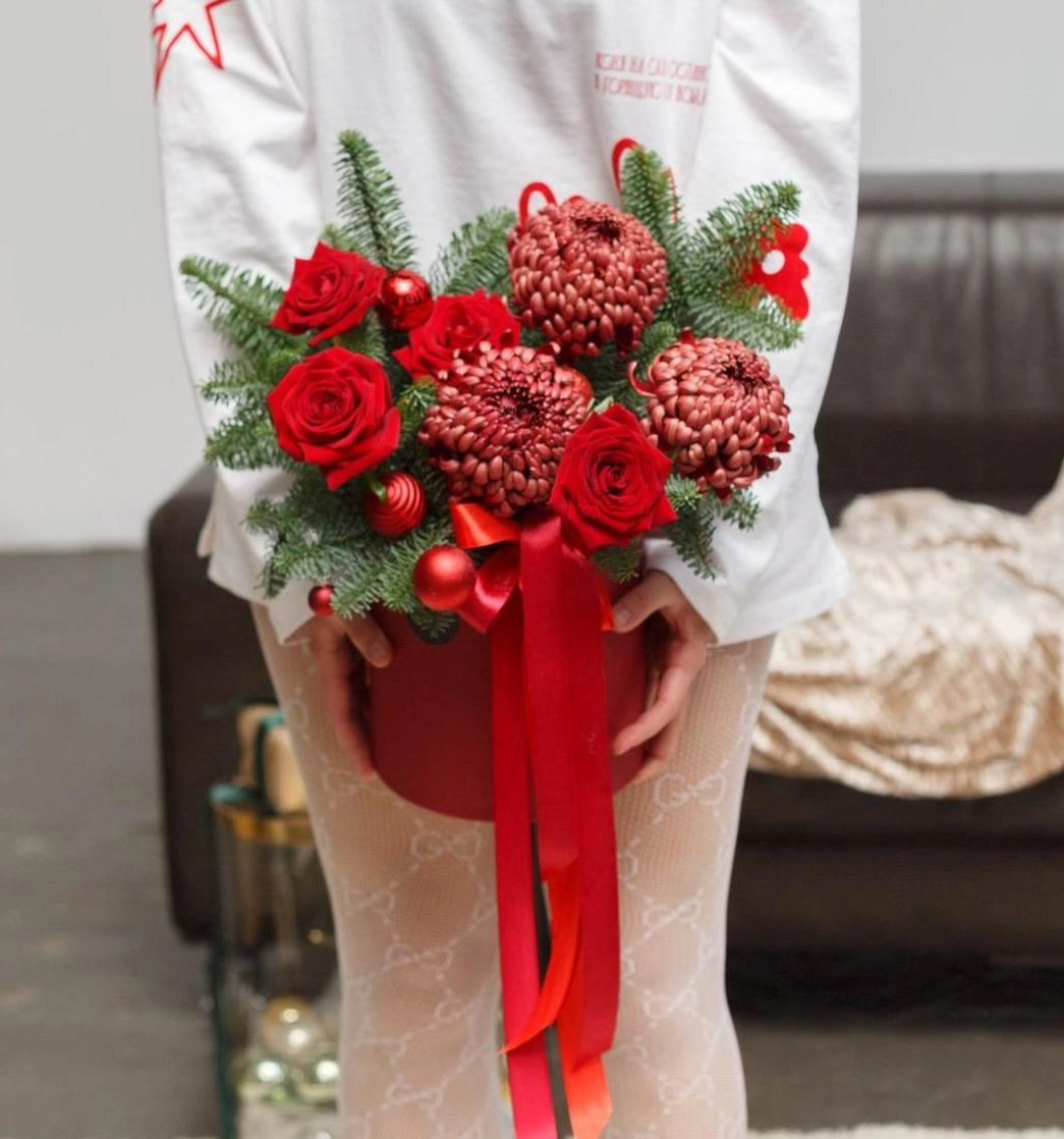 Упаковка: Новогодняя игрушка лайт: 6 шт, Коробка шляпная маленькая: 1 шт, Губка флористическая: 0,5 шт, Лента атласная: 2 шт, Пленка лайт: 0,5 шт