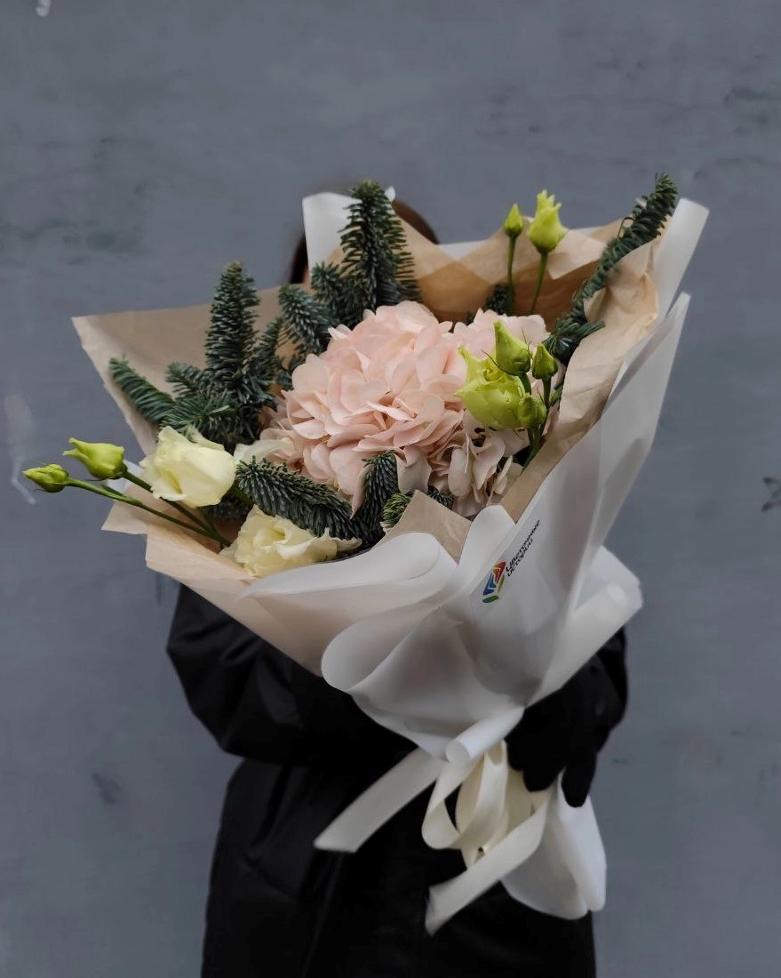 Состав букета: Гортензия: 1 шт, Нобилис: 0,6 шт, Эустома: 1 шт