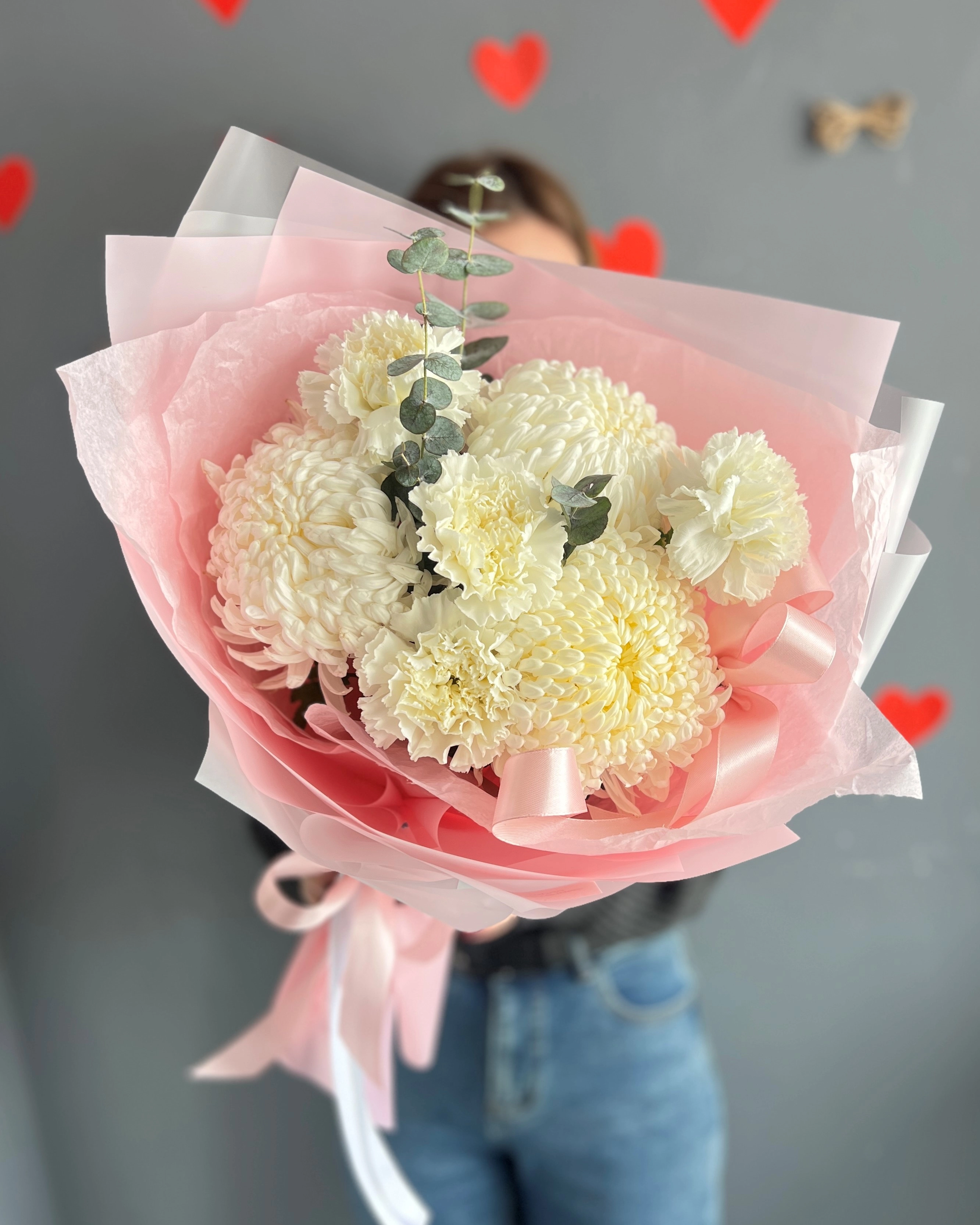 Состав букета: Эвкалипт: 0,7 шт, Хризантема одноголовая премиум: 3 шт, Диантус цветной: 4 шт