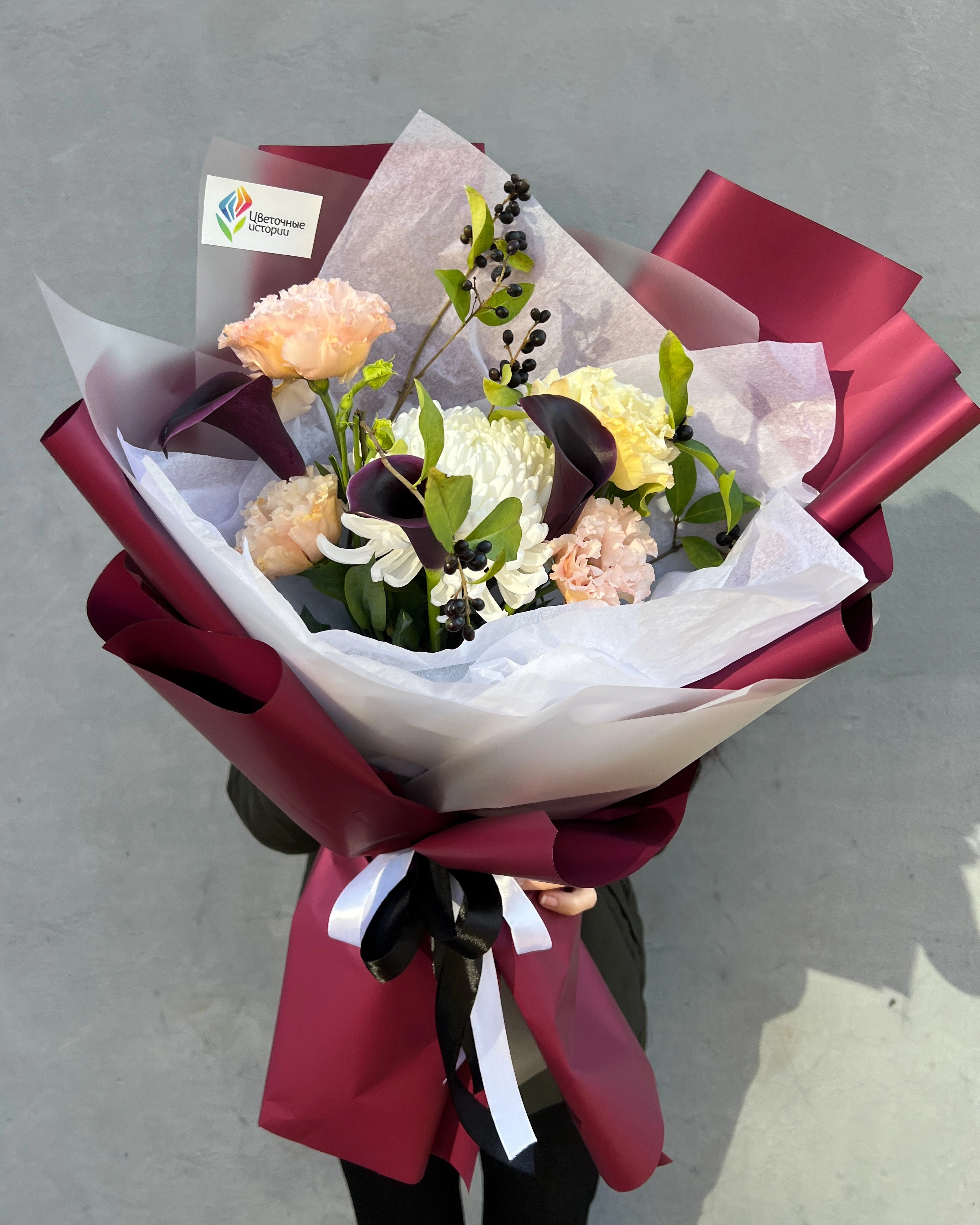 Состав букета: Хризантема одноголовая премиум: 1 шт, Калла: 3 шт, Эустома: 1 шт, Бузина: 1 шт