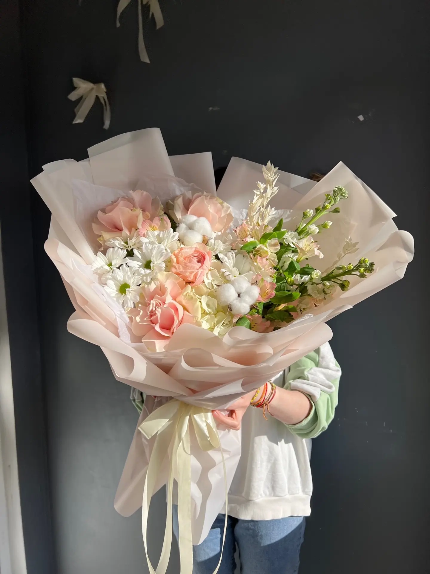 Состав букета: Ранункулюс: 1 шт, Роза 50/60 см (Эквадор): 3 шт, Гортензия: 1 шт, Хризантема кустовая: 2 шт, Альстромерия: 3 шт, Рускус стабилизированный: 1 шт, Маттиола: 2 шт, Хлопок: 2 шт