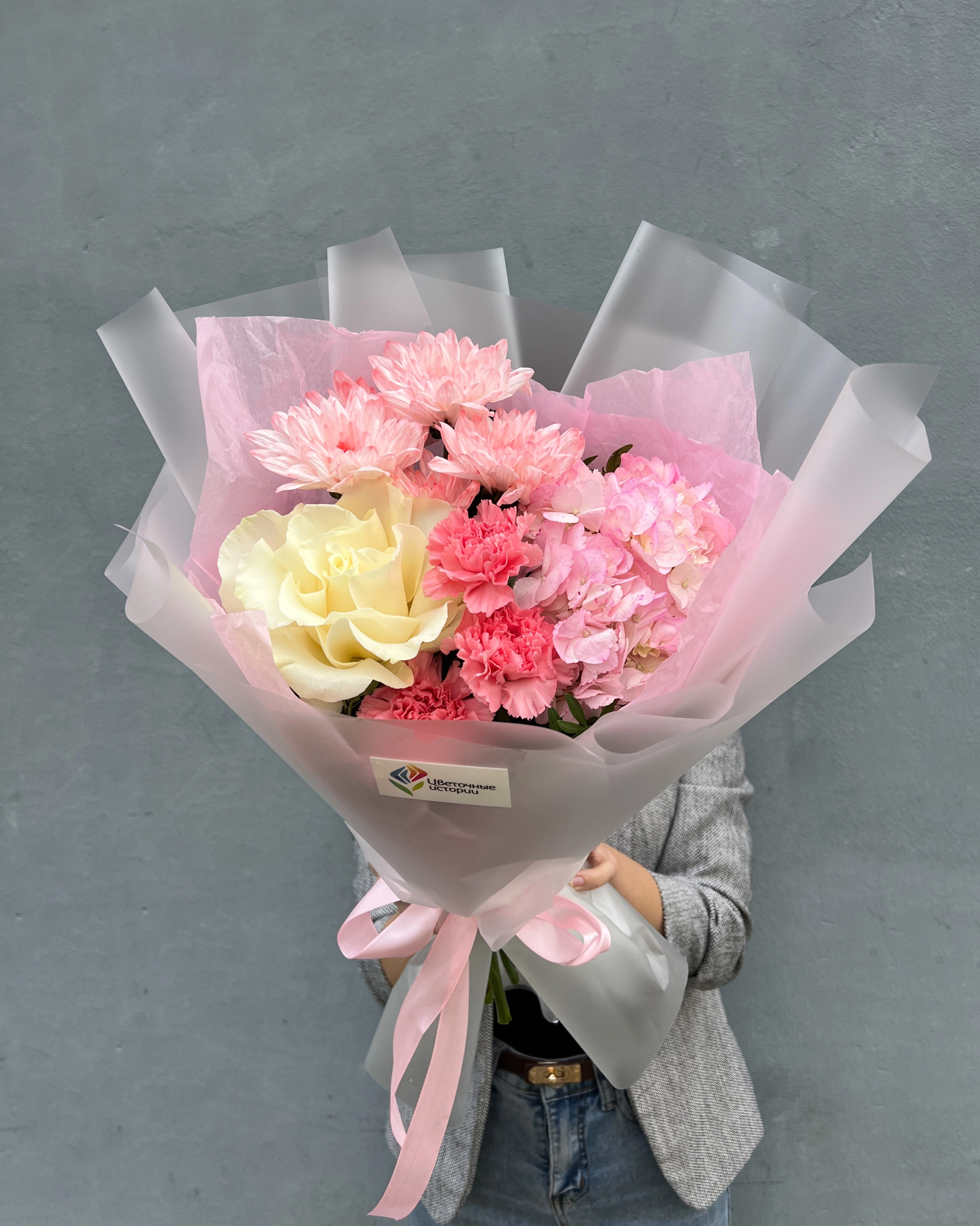 Состав букета: Роза 50/60 см (Эквадор): 1 шт, Гортензия: 1 шт, Хризантема кустовая: 1 шт, Писташ: 1 шт, Диантус цветной: 4 шт