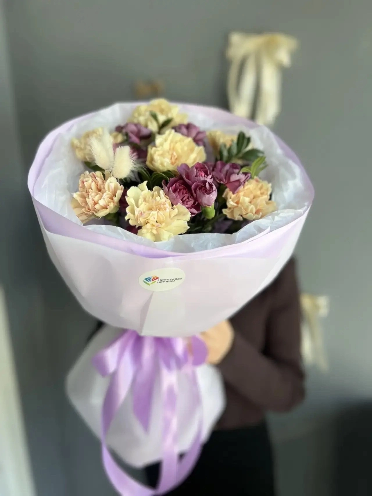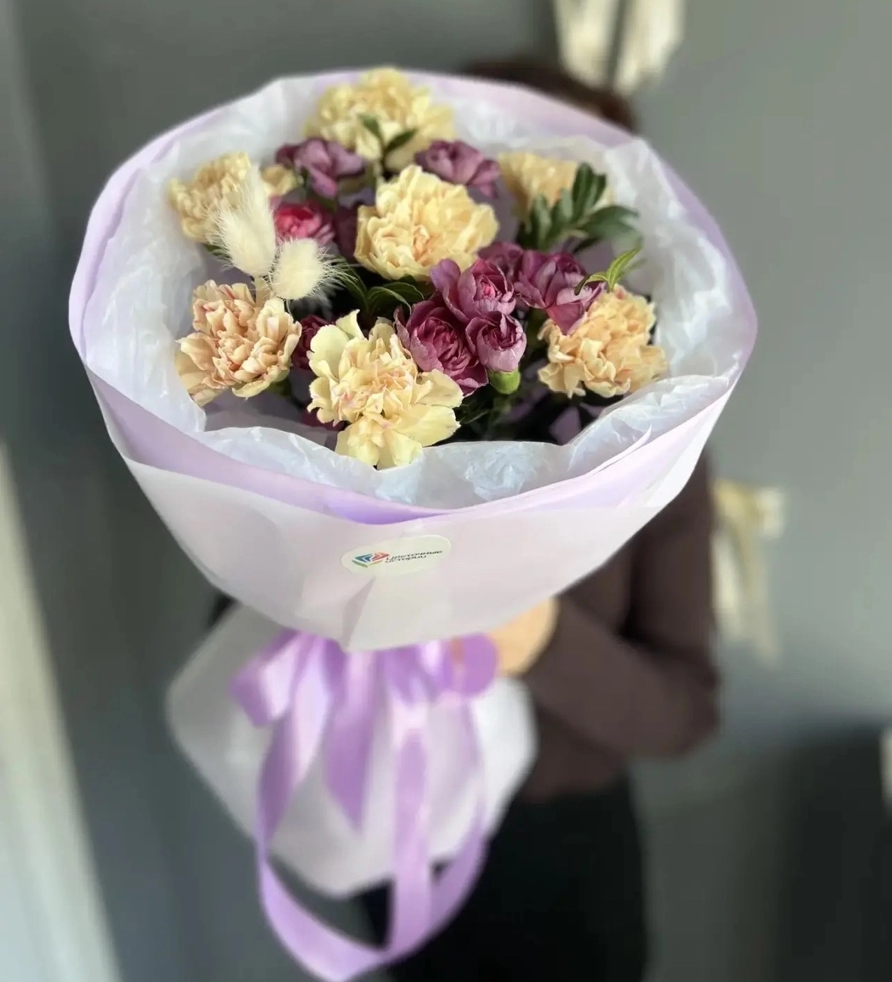 Состав букета: Диантус цветной: 7 шт, Диантус кустовой: 4 шт, Лагурус: 3 шт, Писташ: 1 шт