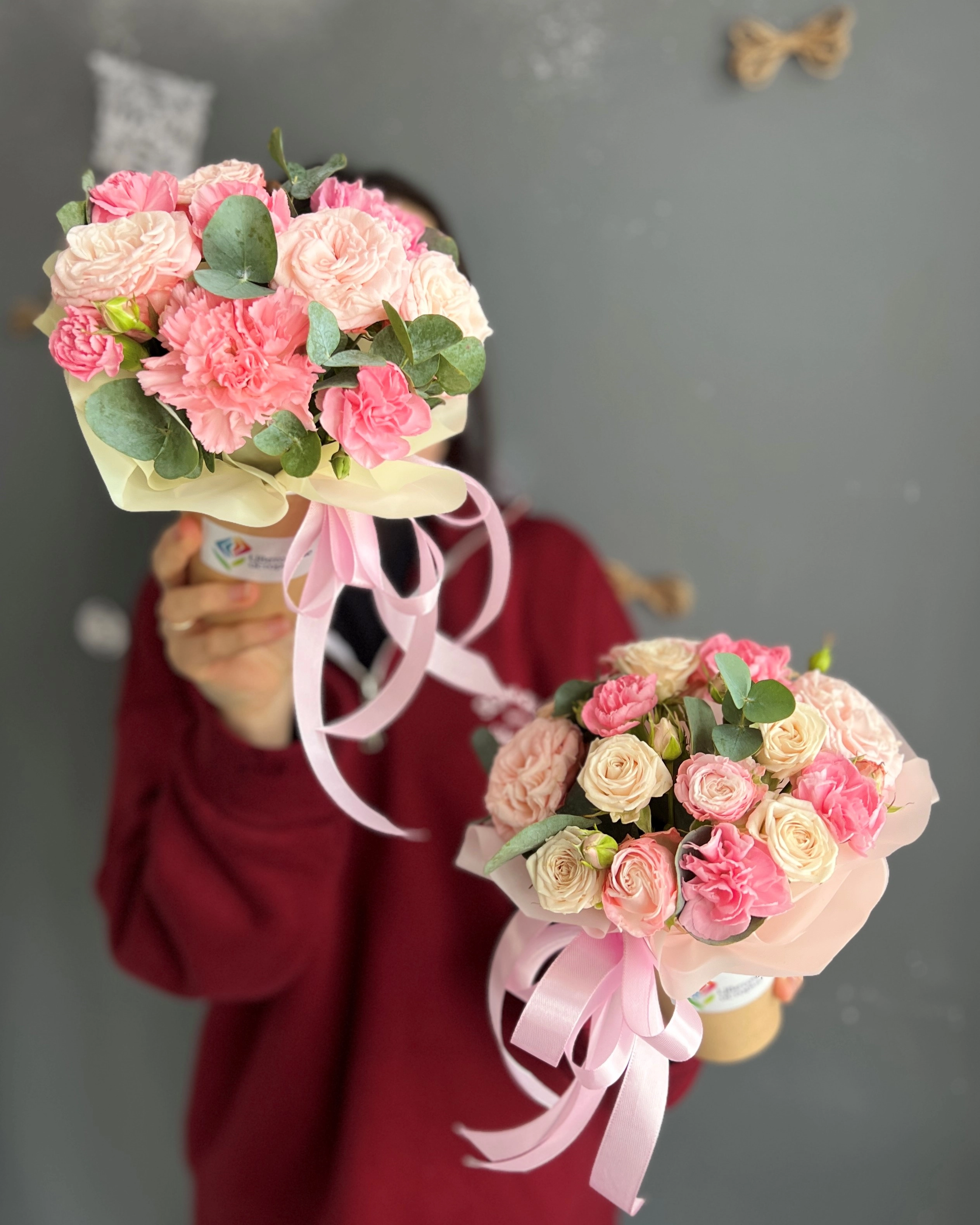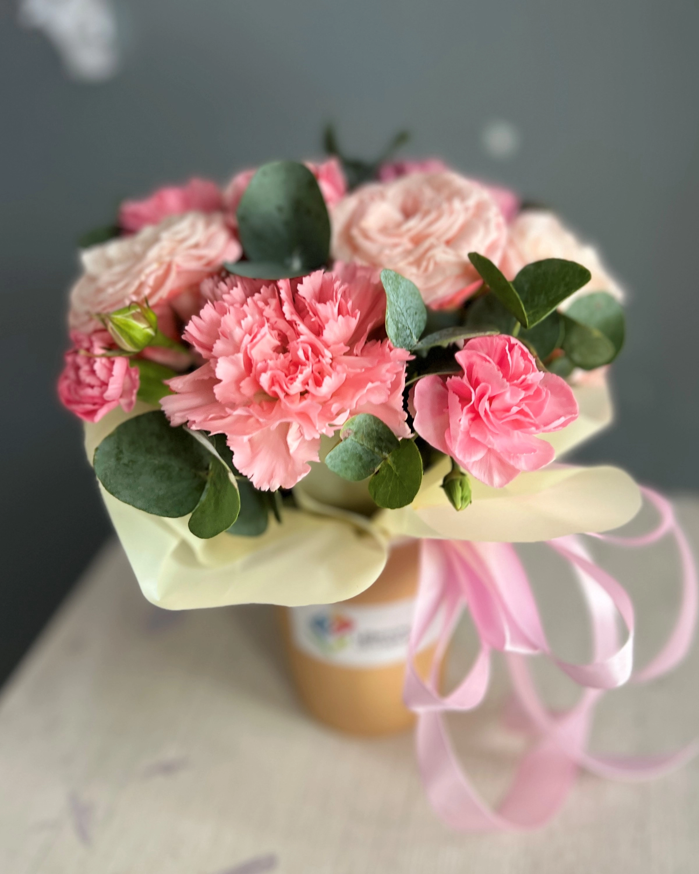 Комплимент из диантусов, роз и ароматного эвкалипта №1