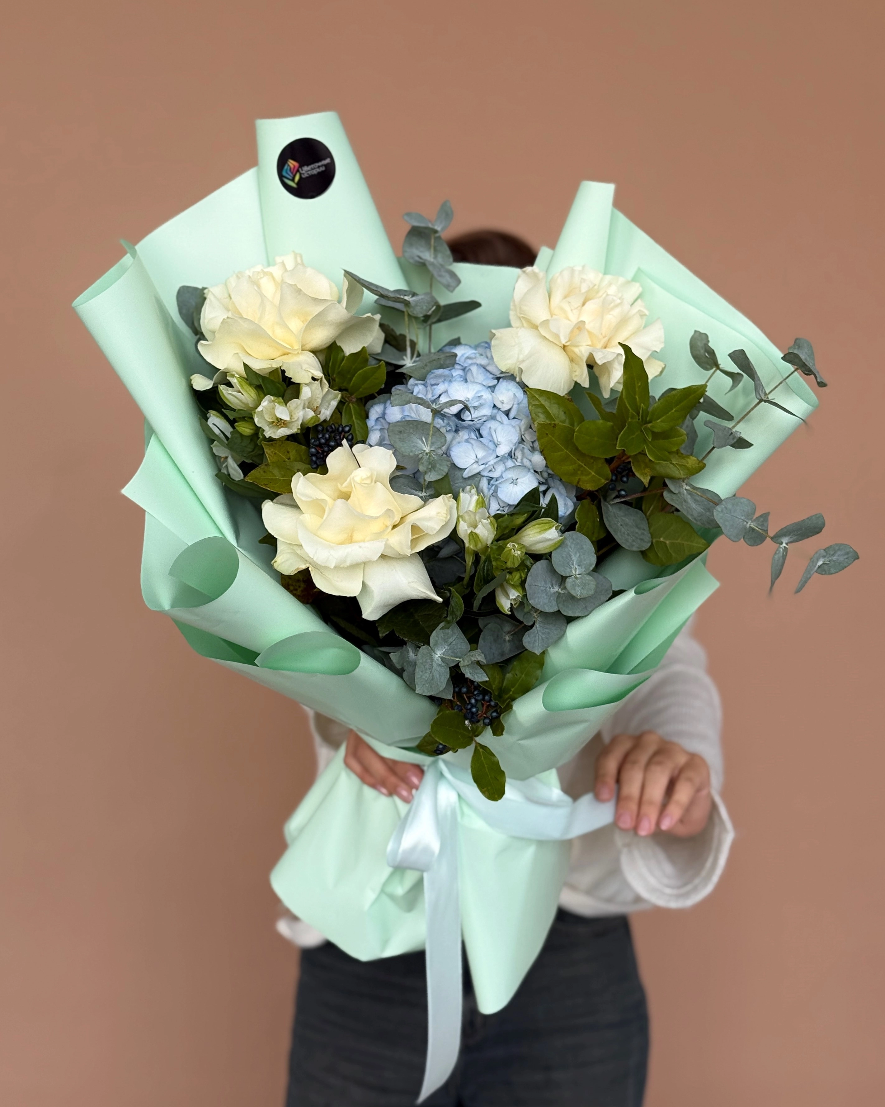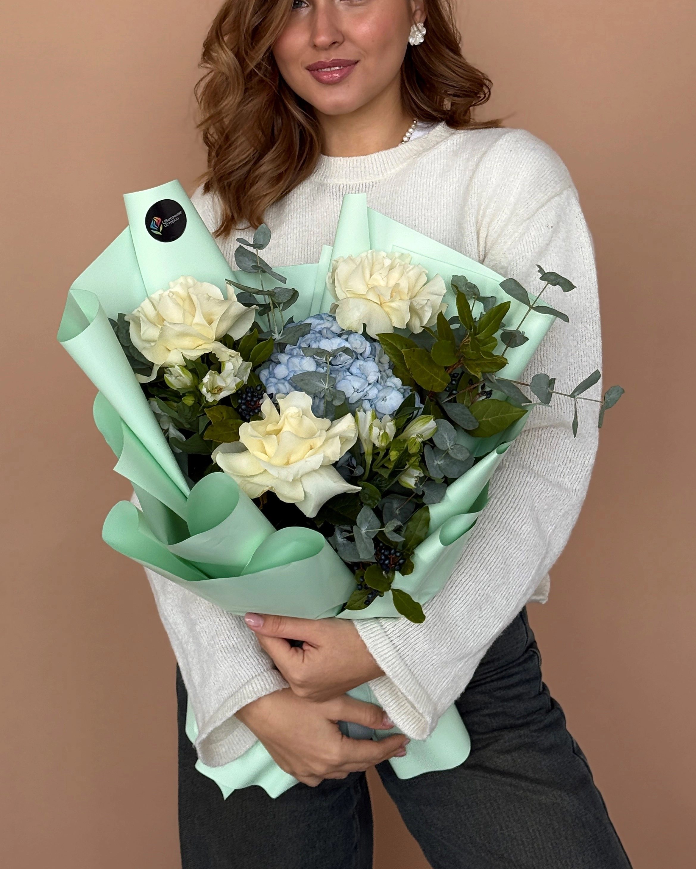 Состав букета: Гортензия: 1 шт, Вибурнум: 1 шт, Альстромерия: 2 шт, Роза 50/60 см (Эквадор): 3 шт, Эвкалипт: 1 шт