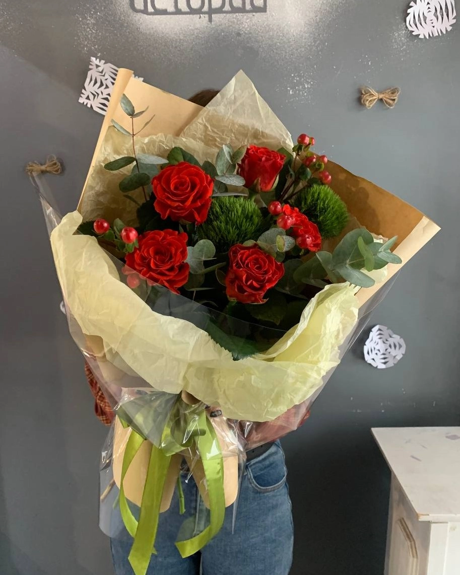 Состав букета: Роза 50/60 см (Россия): 5 шт, Гиперикум: 1 шт, Грин Трик: 2 шт, Эвкалипт: 1 шт