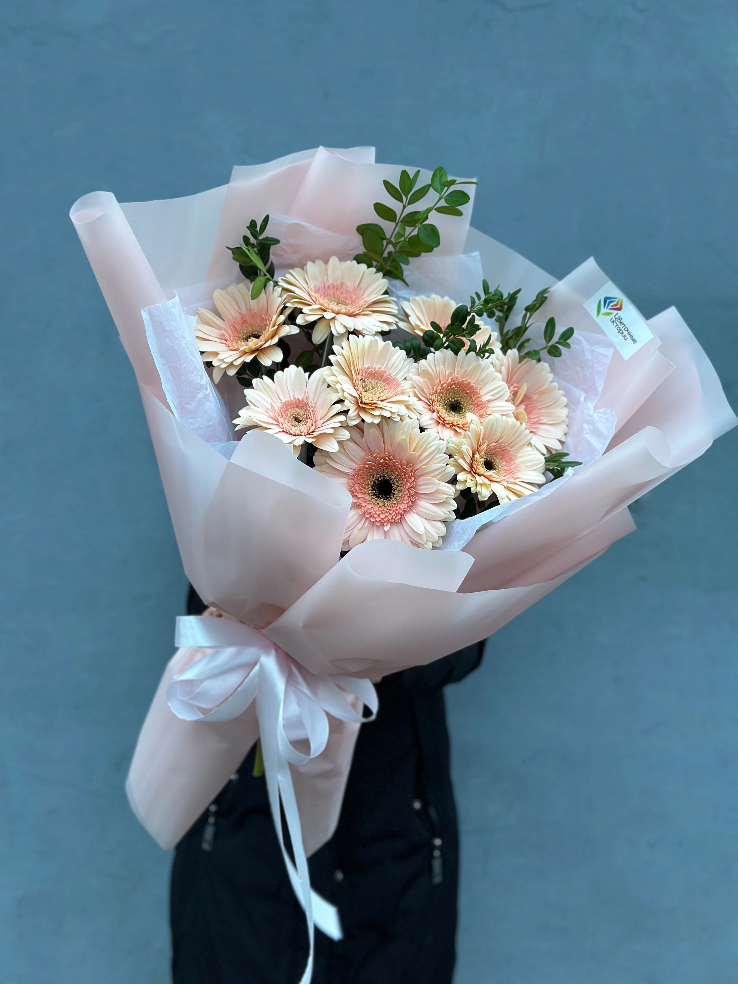 Состав букета: Гербера: 9 шт, Самшит: 3 шт