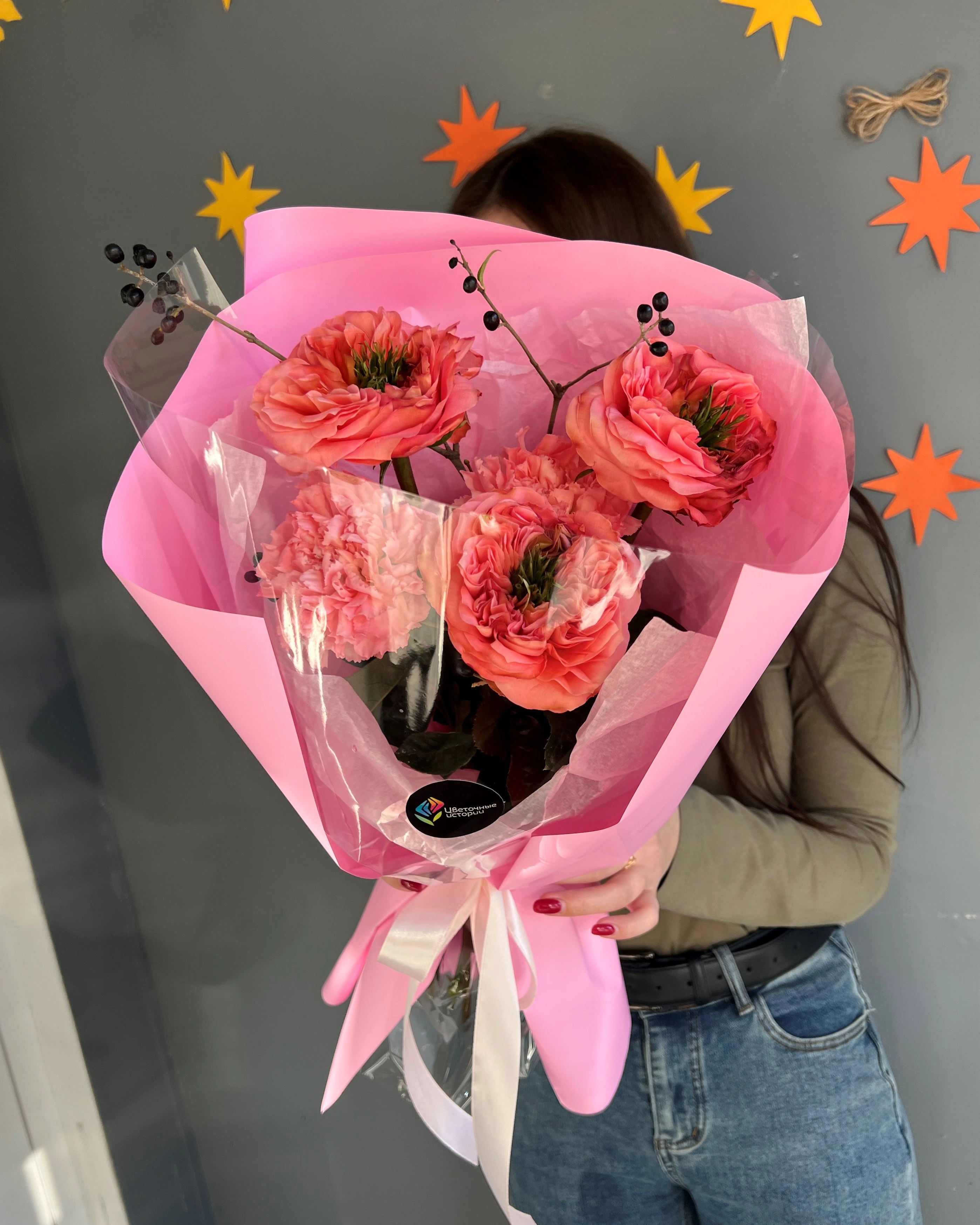 Состав букета: Роза пионовидная 50 см: 3 шт, Диантус цветной: 2 шт, Бузина: 1 шт