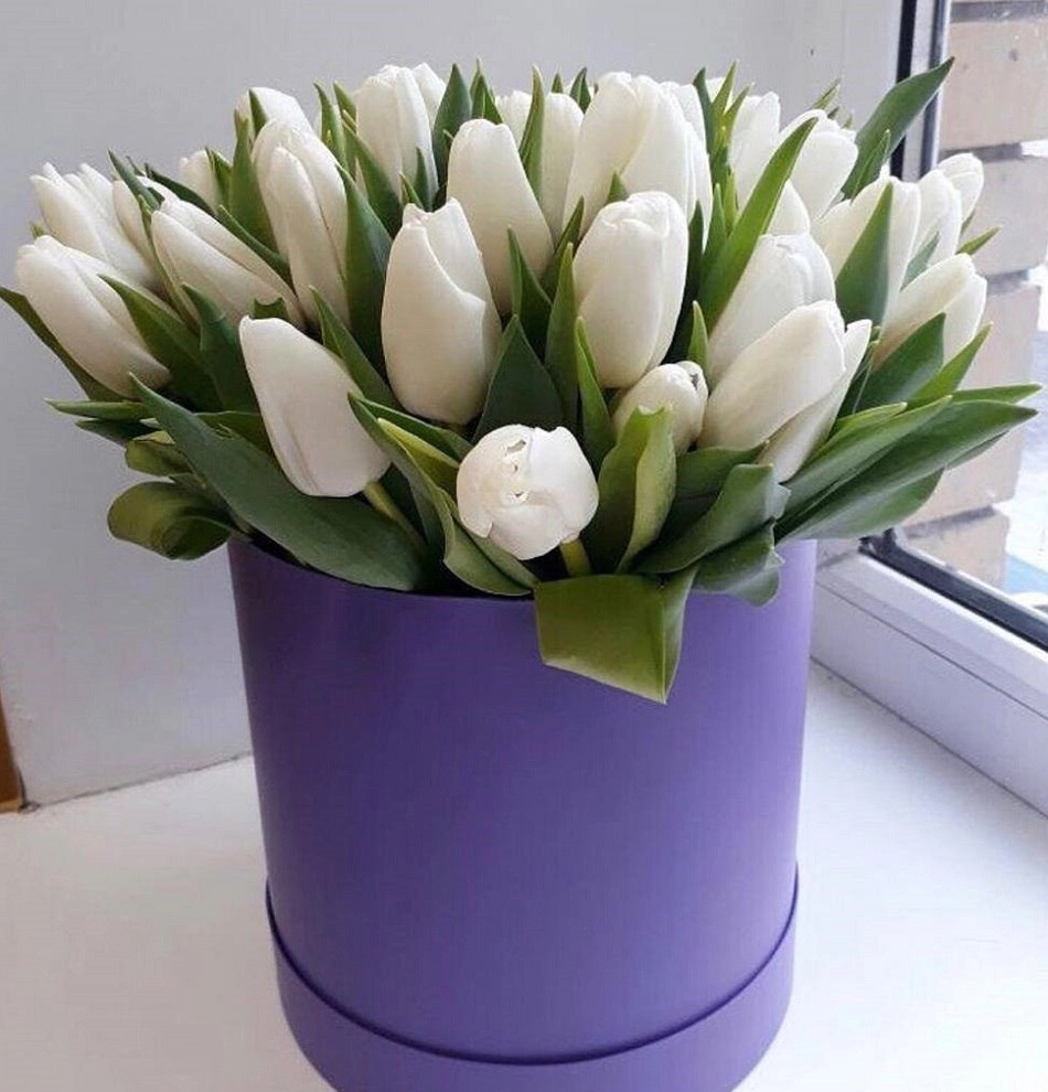 25 белых тюльпанов в шляпной коробке