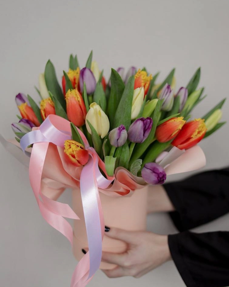 35 разноцветных тюльпанов в коробке