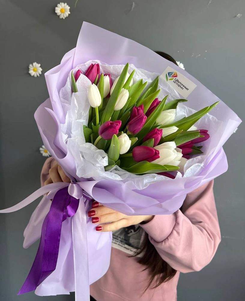 Букет "25 белых и фиолетовых тюльпанов в оформлении"