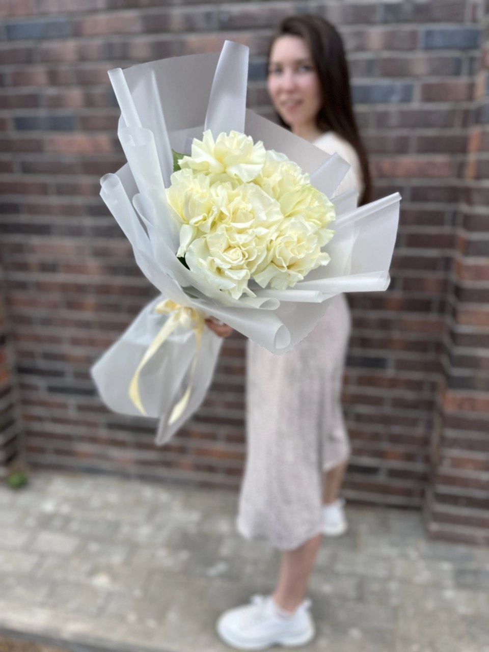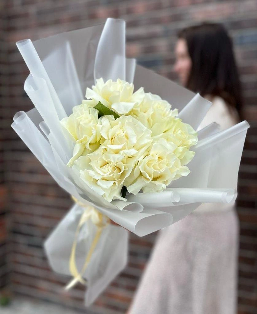 7 белых французских роз в светлом оформлении